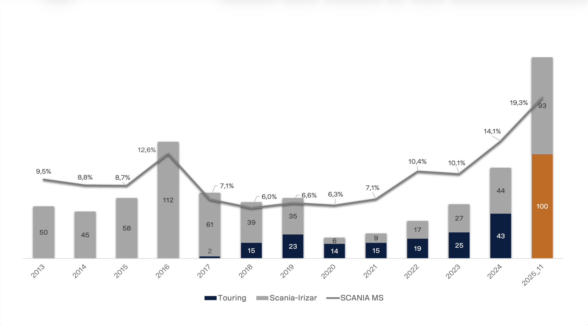 Sorrisoni in quel di Trento durante la consueta conferenza stampa che tira le fila dell’anno ormai agli sgoccioli. I numeri snocciolati da Roberto Caldini, grande capo della divisione bus italiana, spiegano il perché dei volti allegri: il 2025, che chiuderà con circa 280 mezzi Scania (Irizar su telaio del Grifone compresi) è l’anno più di successo del Grifone nel nostro paese. Una cifra che va oltre il 6 per cento di share a fine novembre, quando l’immatricolato bus Scania Italia era calcolato a 230 pezzi su un totale di 3.629 mezzi targati da tutte le marche. E il dato è ancora più positivo se ci si concentra sui Classe III turistici, dove ormai Scania detiene il 19,3 per cento di quota di mercato, al secondo posto dietro Daimler Buses, grazie all’ottimo Touring Hd by Higer venduto in un centinaio di pezzi ma anche agli Irizar, di cui ne piazzano 93.
