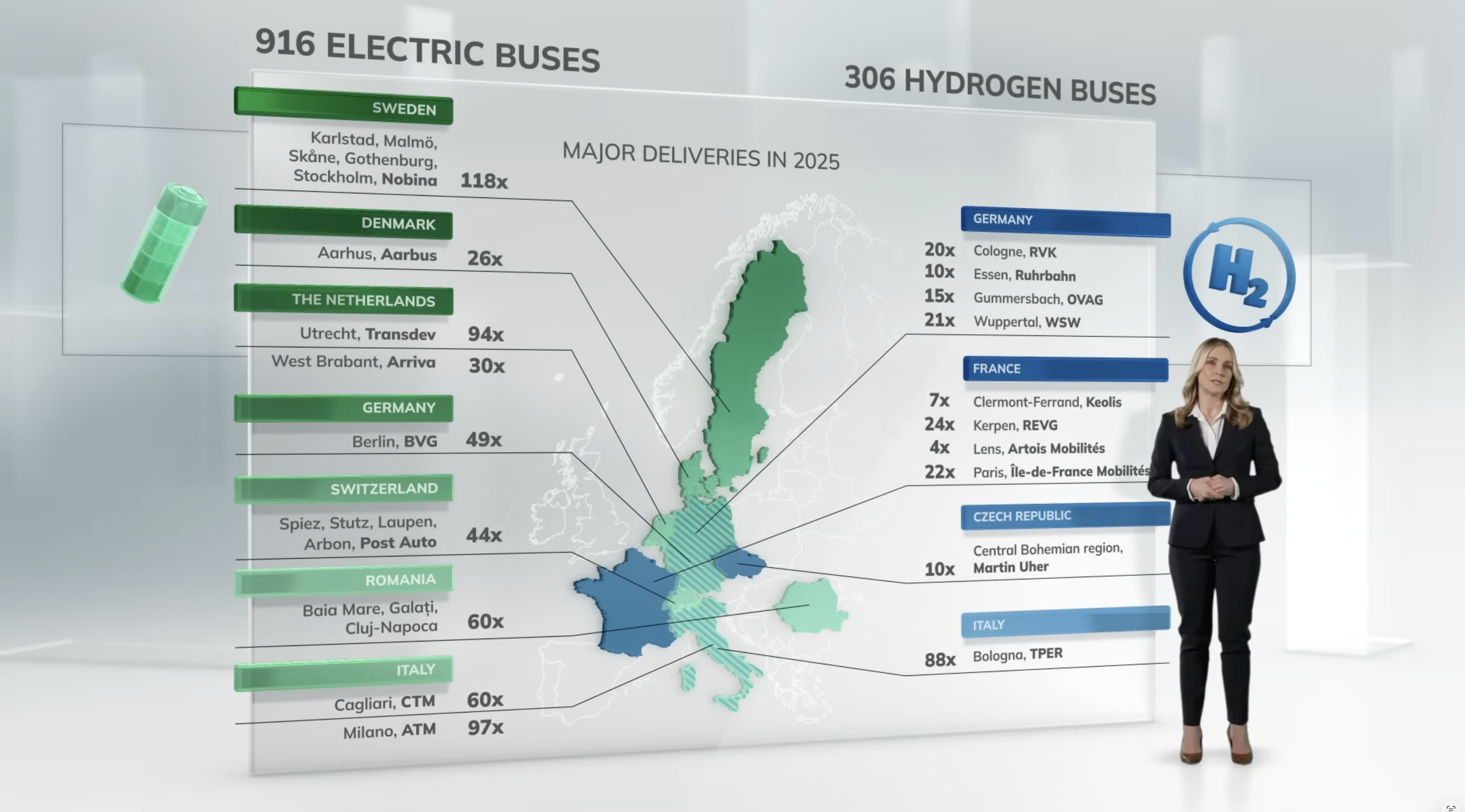 Nel segmento a zero emissioni, l'azienda ha raggiunto una quota dell'11 per cento nel mercato degli autobus a batteria e del 58 in quello degli autobus a idrogeno. Complessivamente, includendo sia gli autobus a batteria sia gli idrogeno, nel 2025 l'azienda si è classificata terza in Europa nel segmento degli autobus urbani a zero emissioni, con una quota di mercato di quasi il 14 per cento. Ma sul lungo termine, considerando il numero totale di autobus a emissioni zero consegnati in Europa dal 2012 fino alla fine del 2025, Solaris ha mantenuto la sua posizione di leader di mercato, come nell'anno precedente.